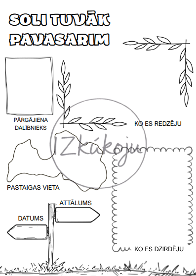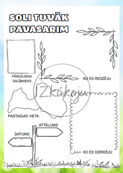 “Soli tuvāk pavasarim” ir radoša un izzinoša darba lapa, kas paredzēta bērnu iesaistei pavasara pārgājienos. Tās mērķis ir veicināt interesi par dabas pārmaiņām pavasarī, kā arī attīstīt novērošanas, aprakstīšanas un refleksijas prasmes.