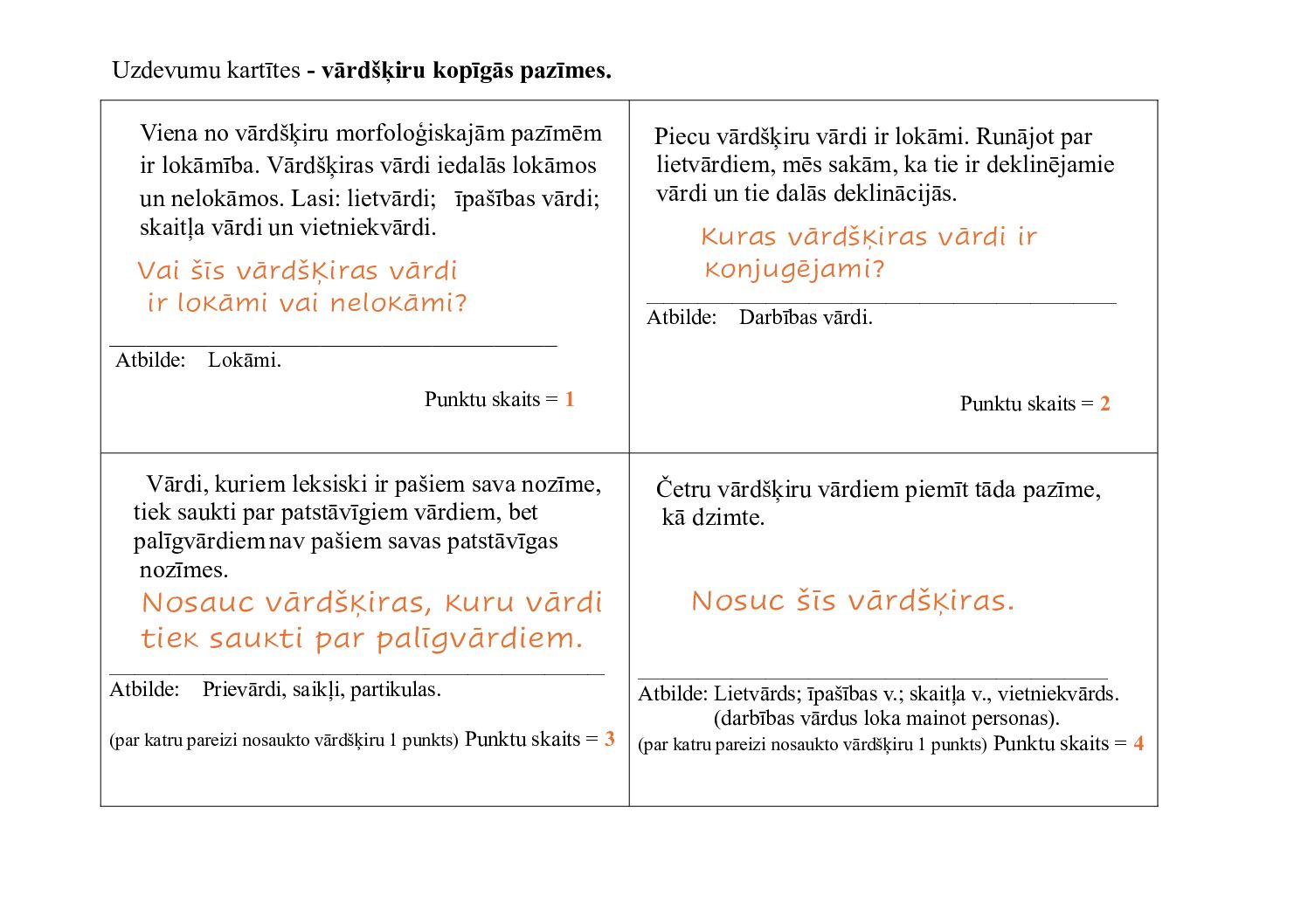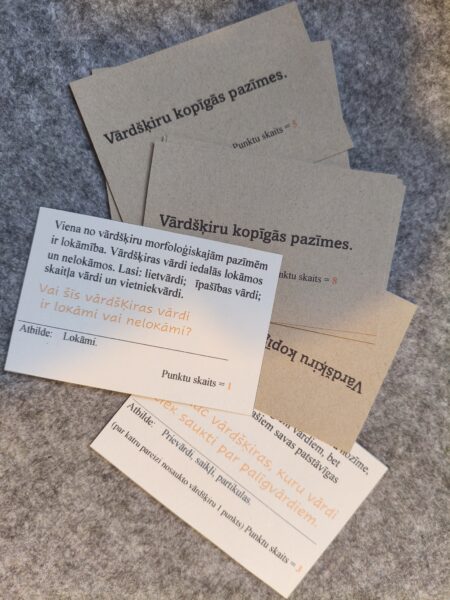 Uz divām lapaspusēm ir 8 kartītes ar jautājumiem par vārdšķiru kopīgajām pazīmēm. Katrs jautājums ir novērtēts ar noteiktu punktu skaitu, cik skolēns var iegūt spēlējot viktorīnu un atbildot uz noteikto jautājumu.