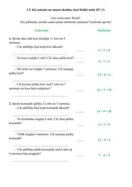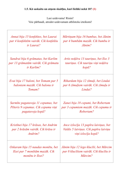 3) Lasa uzdevumu! Saskaita un atņem divus skaitļus 20 robežās (3 – 4 secīgas darbības)! Veic pārbaudi, atrodot uzdevumam atbilstošu izteiksmi! (III kognitīvais līmenis) – 3 A4 formāta lapas (doc un pdf), 6 teksta uzdevumi + 3 A4 (pdf un doc) atbilžu lapas.