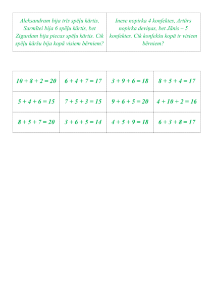 2) Lasa uzdevumu! Saskaita trīs skaitļus 20 robežās! Veic pārbaudi, atrodot uzdevumam atbilstošu izteiksmi! (II kognitīvais līmenis) – 2 A4 formāta lapas (doc un pdf), 12 teksta uzdevumi + 2 A4 (pdf un doc) atbilžu lapas.