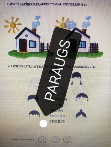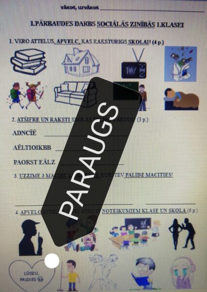 Apvelk attēlus, kas raksturīgi skolai, atšifrē un raksta skolas telpas vārdus, apvelk attēlus, kuri atbilst noteikumiem klasē un skolā, atrod 5 atšķirības un apvelk tās, atpazīst emocijas pēc attēla, savieno ar atbilstošo nosaukumu.