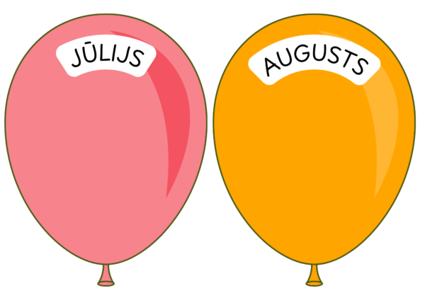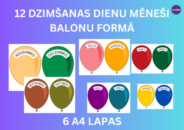 Komplektā 6 A4 lapas ar 12 baloniem (katrs mēnesis savā krāsā).