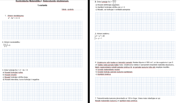 Kontroldarbs (2 varianti) veidots pēc Skola2030 Matemātika I programmas un sastāv no 10 daudzveidīgiem uzdevumiem. Tajā iekļauti algebras, funkciju analīzes, nevienādību, sistēmu, progresiju un varbūtības uzdevumi, kā arī sarežģīti tekstuzdevumi ar modelēšanu un optimizāciju.
