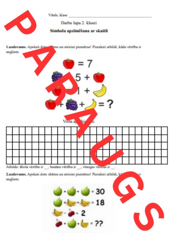 - Darba lapā ir uzdevumi par simbola apzīmējumiem skaitļu vietā izteiksmēs un attēlos. Derētu arī darbam ar talantīgajiem skolēniem, matemātikas fakultatīvā utml.