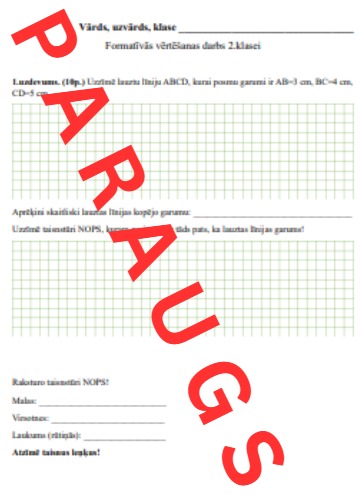 - Otrajā FVD ir uzdevumi par lauztas līnijas konstruēšanu un kopēja garuma aprēķināšanu, taisnstūra konstruēšana ar norādīto perimetru, figūru atrašanas vietu norādīšana koordinātu plaknes 1. kvadrantā, ka arī summu un starpību pieraksts un aprēķināšana 100 apjoma norādītajās figūrās.