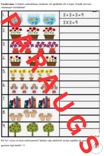- Otrajā darbā ir kompleksa veida 5 uzdevumi, piemēram, saskaitīšanas aizvietošana ar reizināšanu attēlos un rakstos, izteiksmju salīdzināšana, situācijas uzdevumi.