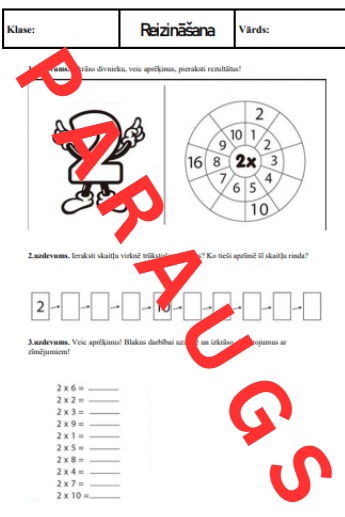 - Pirmajā darba lapā ir klasiska tipa 7 uzdevumi (ievaduzdevumi) reizināšanai ar 2. Reizināšanas aplis ar 2, piemēru risināšana, izteiksmju salīdzināšana, situāciju uzdevums.