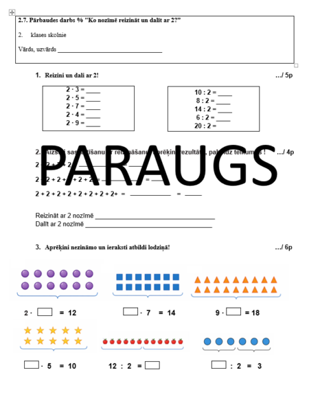 Pārbaudes darbs 2. klasei par tēmu “Reizināšana un dalīšana ar 2”. Materiāls palīdz skolēniem nostiprināt izpratni par reizināšanu kā atkārtotu saskaitīšanu un dalīšanu kā sadalīšanu vienādās daļās.