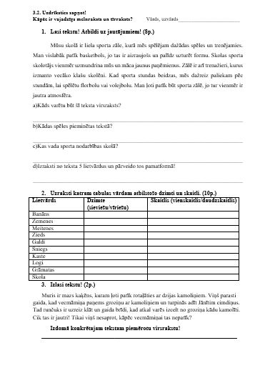 Darbs ar tekstu, izdomā virsrakstu, atrod tekstā 5 lietvārdus un pārveido pamatformā, aizpilda tabulu, kur jānosaka dzimte un skaitlis, labo tekstā kļūdas, raksta nelielu stāstījumu.