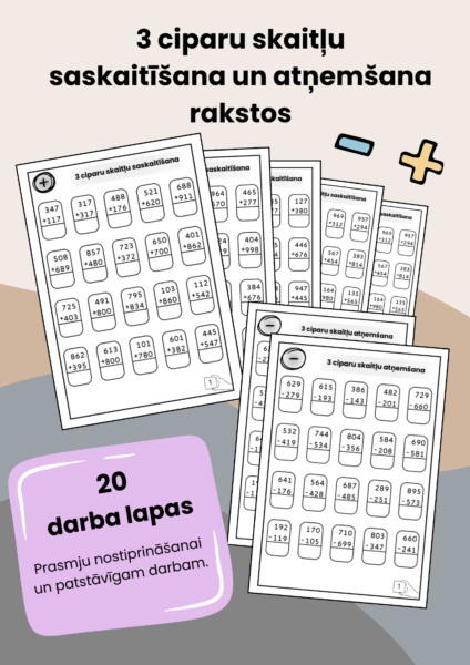 • 10 darba lapas ar 3 ciparu skaitļu saskaitīšanu rakstos