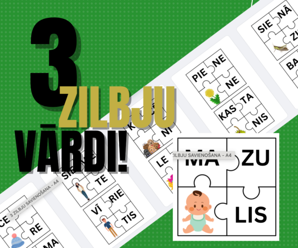 14 vārdi sadalīti 3 zilbēs + atbilstošs attēls, lai spēlējoties iemācītos vārdu dalījumu zilbēs!