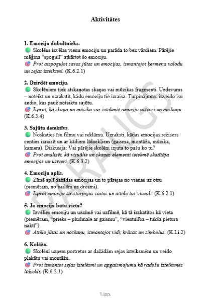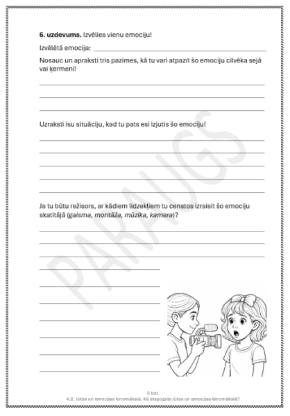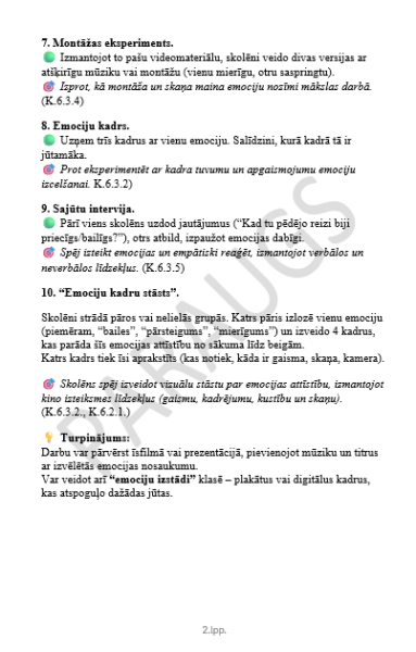 10 Papildus aktivitātes dod iespēju padziļināt tēmu — veidot īsfilmas, montāžas eksperimentus vai klasē izstādīt “emociju kadrus”.