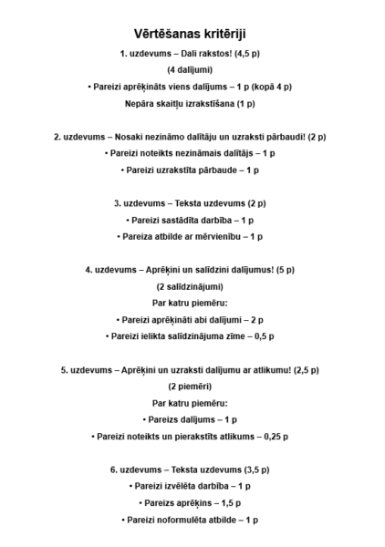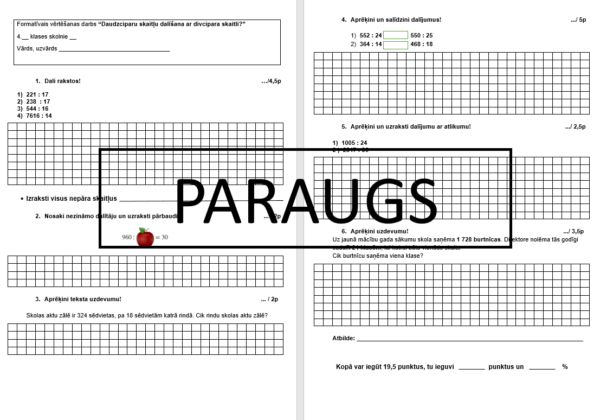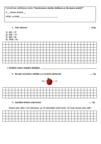 Formatīvais vērtēšanas darbs “Daudzciparu skaitļu dalīšana ar divciparu skaitli” paredzēts, lai pārbaudītu skolēnu izpratni par rakstisko dalīšanu, dalīšanu ar atlikumu, nezināmā dalītāja noteikšanu un teksta uzdevumu risināšanu. Darbā iekļauti daudzveidīgi uzdevumi, kas ļauj izvērtēt gan aprēķinu prasmes, gan matemātiskās domāšanas attīstību. Materiāls veidots skaidrā, skolēniem saprotamā formātā un piemērots darbam klasē vai individuālai vērtēšanai.