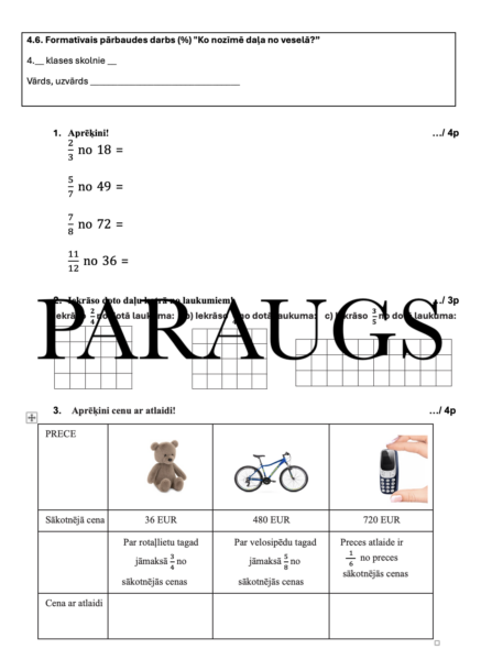 Šis ir formatīvais pārbaudes darbs 4. klasei matemātikā tematā “Daļa no veselā”. Darbs ietver dažādu tipu uzdevumus: daļas aprēķināšanu no skaitļa, vizuālu daļu noteikšanu, cenu aprēķinus ar atlaidi, kā arī teksta uzdevumus. Pārbaudes darbs palīdz skolēniem nostiprināt izpratni par daļām un to pielietojumu ikdienas situācijās. Iekļauti arī vērtēšanas kritēriji.