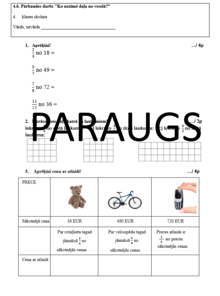 Pārbaudes darbs 4. klasei matemātikā tematā “Daļa no veselā”. Darbs ietver dažādu tipu uzdevumus: daļas aprēķināšanu no skaitļa, vizuālu daļu noteikšanu, cenu aprēķinus ar atlaidi, kā arī teksta uzdevumus. Pārbaudes darbs palīdz skolēniem nostiprināt izpratni par daļām un to pielietojumu ikdienas situācijās. Iekļauti arī vērtēšanas kritēriji.