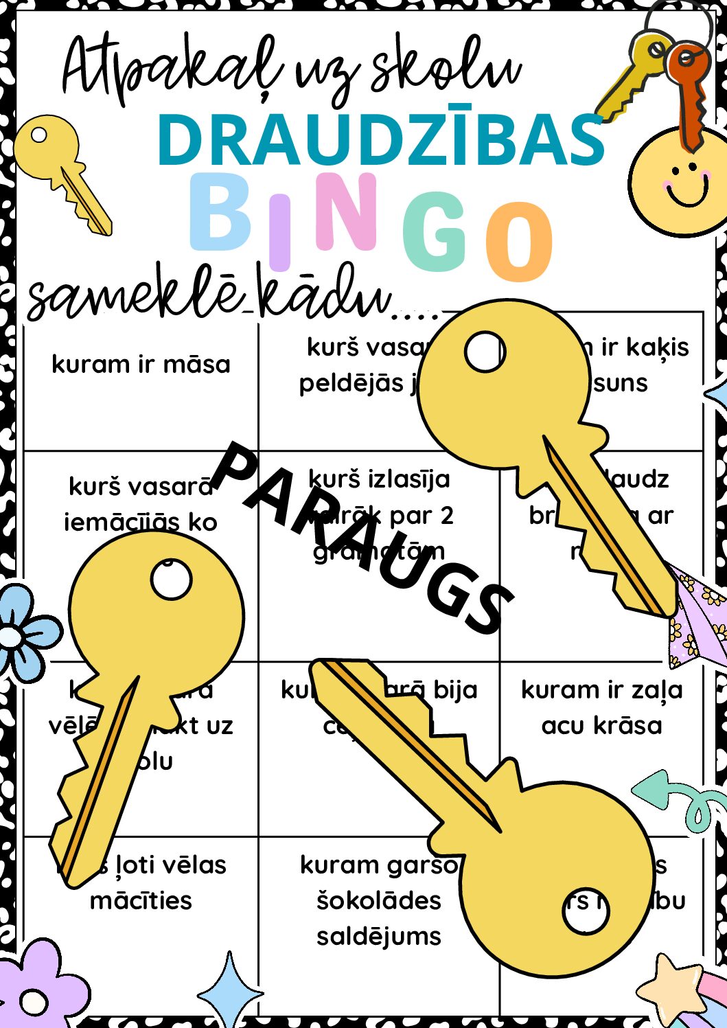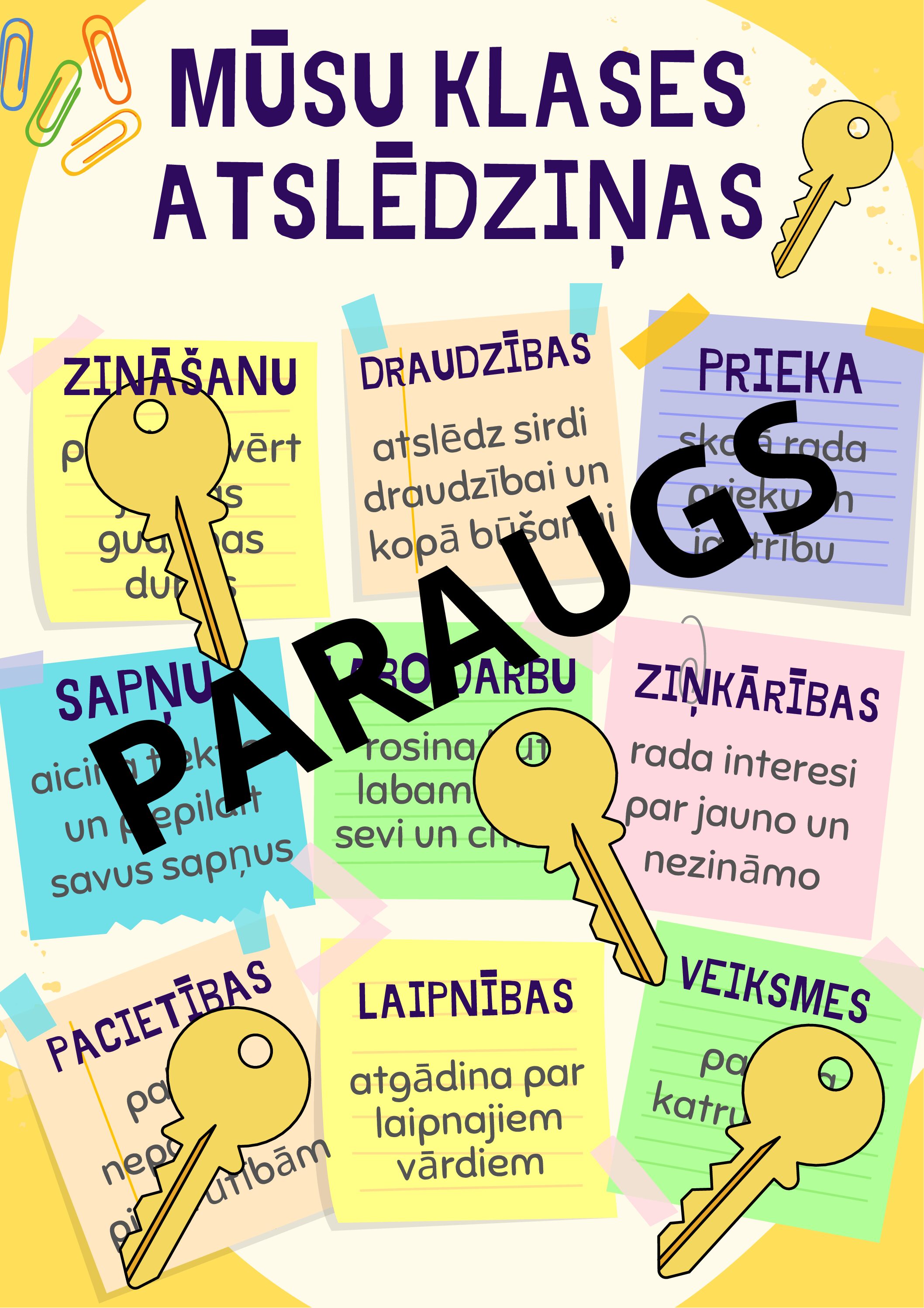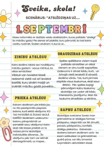 Materiālā ietilpst: plakāts ar dažādu atslēdziņu (vērtību) skaidrojumiem un trafarets lielo atslēgu veidošanai- izmantošanai klasē. Sevis izzinoša aktivitāte- “Mans jaunais mācību gads…”, saliedēšanās spēle ar Bingo, jautrībai prognožu spēle jaunajam mācību gadam un gatava dāvana noslēgumā, par tēmu.