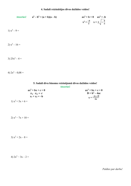 5. Kā izmanto izteiksmju sadalīšanu reizinājos? atk.