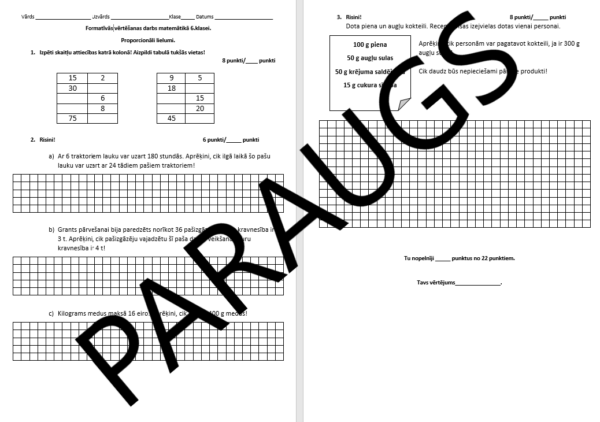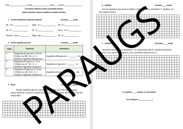 3 formatīvās vērtēšanas darbi (Skaitļu attiecības. Kopuma sadalīšana noteiktā attiecībā. Proporcionāli lielumi. Mērogs.)