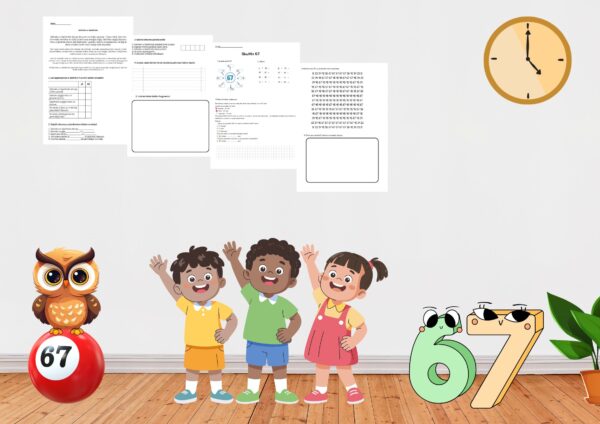 Darba lapā “Matemātika 67” bērni rēķina, risina situāciju, spēlējas ar naudu (67 centi!), un beigās — atklāj noslēpumu, izkrāsojot smaidīgu seju no skaitļiem.