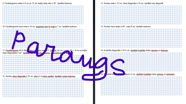9. klases matemātikas darba lapa ir paredzēta gatavošanai eksāmenam (balstīta uz Skola2030 programmu) un sastāv no 20 dažādu veidu ģeometrijas uzdevumiem par leņķiem, trijstūriem un četrstūriem (paralelogramu, rombu, kvadrātu un taisnstūri). Tajā iekļauti gan aprēķinu uzdevumi (garumi, leņķi, laukumi, diagonāles), gan uzdevumi ar īpašību izmantošanu un sarežģītāki kombinētie uzdevumi, kuros jāpielieto vairākas zināšanas vienlaikus.