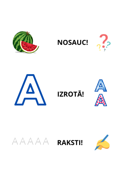 A4 darba lapas. Mērķis – pilnveidot prasmes atpazīst un rakstīt burtus.