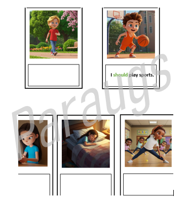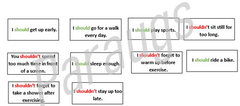 Angļu valodas spēle par aktivitātēm, kurā ietverti vārdi (should, shouln’t). Spēlē ir jāsavieno attēls ar pareizo teikumu. Šo spēli var izmantot kā iesildīšanās elementu stundas sākumā, var būt sastāvdaļa no pašas stundas, kā arī kā nobeiguma pārbaude.