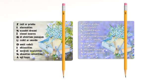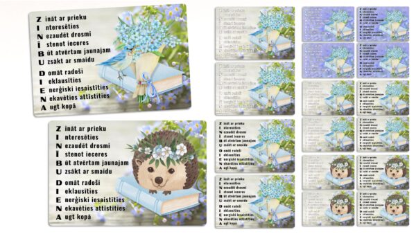 Šis materiāls satur rūpīgi izstrādātas kartītes ar akrostihu vārdam “ZINĪBU DIENA”, kur katras rindiņas sākuma burts veido iedvesmojošu vēstījumu. Kartītes rotā neaizmirstulīšu ziedi, grāmatas, kā arī mīļš putniņš vai ezītis ar ziedu vainagu, radot sirsnīgu un svinīgu noskaņu.