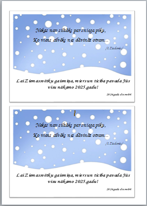 Apsveikums izveidots MS Word lietotnē, lai varētu izdrukāt vairākus apsveikumus un koriģēt to.