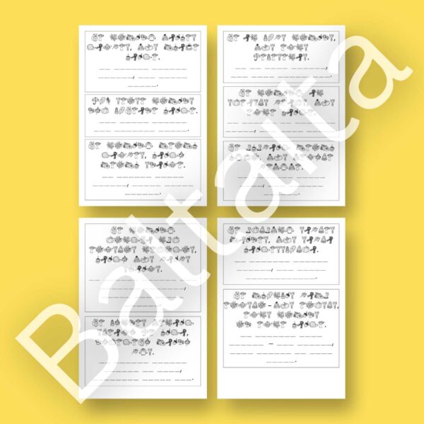 Materiālā iekļauti šifri gan ar vienu uz lapas (darbiem ar solabiedru) kā arī ar 3 šifriem uz vienas lapas, ja atšifrētāju ir vairāk un šifrus paredzēts izgriezt.