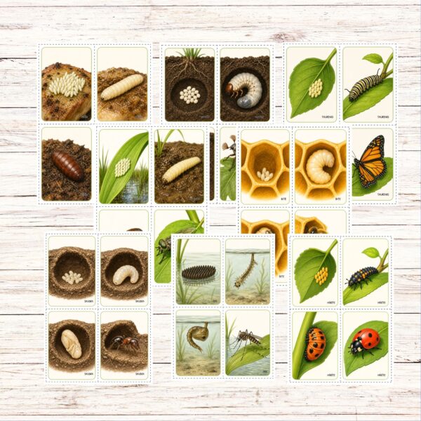 Katrā komplektā bērni redz kukaiņa attīstību no sākuma posma līdz pieaugušam kukainim. Attēli veidoti bērniem saprotamā, vizuāli pievilcīgā stilā – pietiekami reālistiski, lai bērns atpazītu kukaini, bet vienlaikus saudzīgi un piemēroti pirmsskolas vecumam.