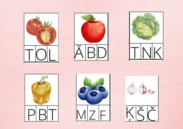 Latvijas augļu, ogu un dārzeņu kartītes, pirmās skaņas noteikšanai vārdā.