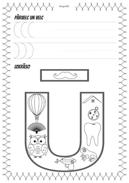 Katrā darba lapas burtā paslēpti vārdi, kas sākas ar attiecīgo burtu.