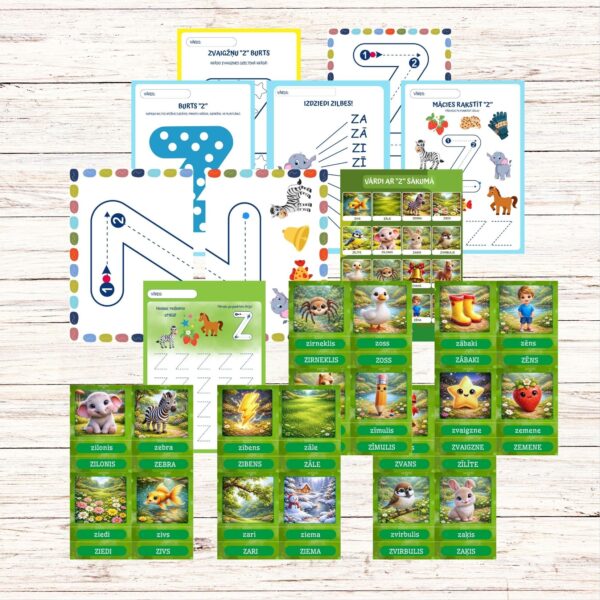 Komplektā iekļautas 16 attēlu kartītes ar Z burtu vārdiem, plakāts un 6 darba lapas, kas veicina:
