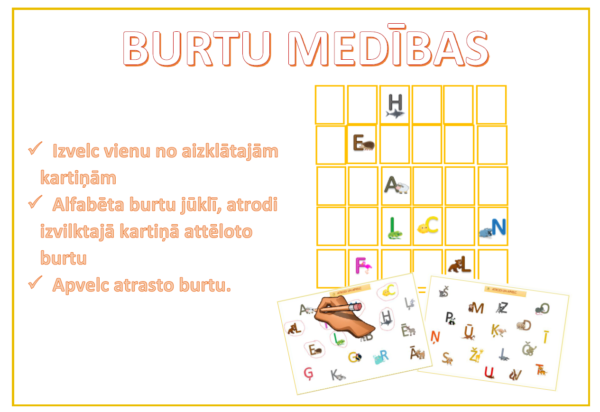 • Burtu medību spēle-Burtu jūkli ir atrodami visi 33 alfabēta burti, kam līdzi nāk 33 kartiņas.