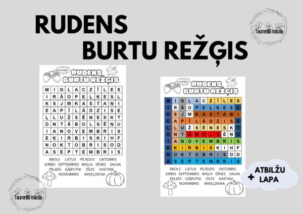 • burtu režģī jāatrod 15 vārdi kas raksturo/apzīmē rudeni