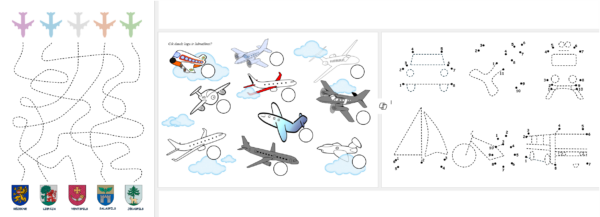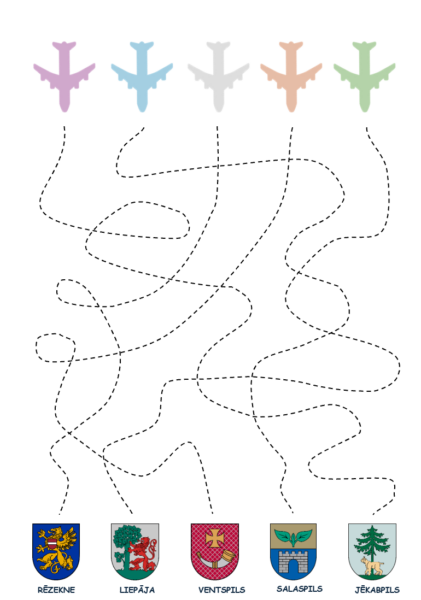Pārvilkt līniju attiecīgajā krāsā, kā lidmašīnai, un noskaidrot, uz kuru pilsētu tā atlido (Rēzekne, Liepāja, Ventspils, Salaspils, Jēkabpils).