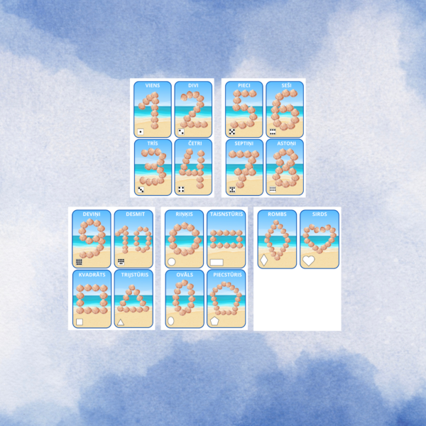 • Materiāls – no gliemežvākiem veidotās ciparu un figūras kartiņas.