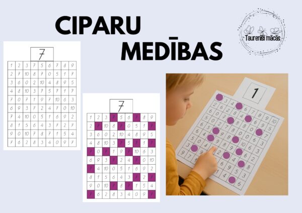 Mērķis: attīstīt ciparu (0–9) atpazīšanu, spēt noturēt uzmanību un attīstīt sīko motoriku, meklējot un apzīmējot norādīto ciparu.
