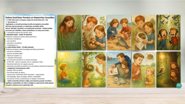 👉 Ideāls materiāls darbam mājās, pirmsskolas grupās vai dabas izglītības nodarbībās, kur bērni rotaļīgā un saprotamā veidā apgūst cieņpilnu attieksmi pret apkārtējo vidi.