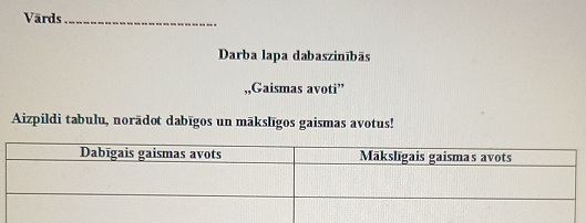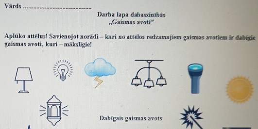 Veicot uzdevumus, bērns aplūkos attēlotos gaimas avotus un norādīs – kurš no tiem ir dabīgais gaismas avots, kurš – mākslīgais; aizpildīs tabulu, patstāvīgi norādot dabīgos un mākslīgos gaismas avotus.