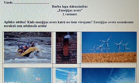 Veicot uzdevumu, skolēns pilnveidos izpratni par enerģijas avotiem. Bērns aplūkos attēlus, noteiks tajos vērojamos enerģijas avotus, uzrakstīs to nosaukumus.