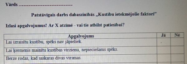 Veicot uzdevumu, skolēns pilnveidos izpratni par faktoriem, kuri ietekmē kustību (berze, masa, inerce). Bērns izlasīs apgalvojumu, atzīmēs – vai tas atbilst patiesībai.