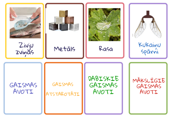 Didaktiskias materiāls. Dabaszinības 4. klase “Gaismas avoti un atstarotāji ” – 26 kartītes ar gaismas avotiem un 24 kartītes ar atstarotājiem. Plus 4 kartītes ar tekstu – gaismas avoti, gaismas atstarotaji, dabiskie gaismas avoti un māksligie gaismas avoti. Var izdrukāt un spēlēt pāros, grupās.