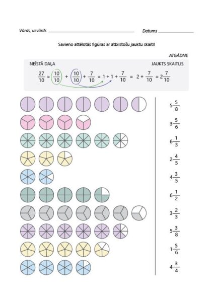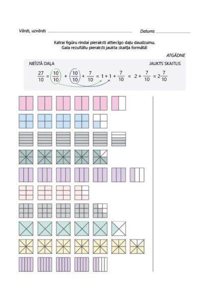 💡 Mācību materiāls iekļauj uzdevumus ar pareizo daļu noteikšanu no iekrāsotās figūras daļas un savienošanu ar atbilstošu daļu (2 lapas), kā arī līdzīgs uzdevums, kur skolēnam noteiktā daļa / atbilde jāieraksta pašam (2 lapas).