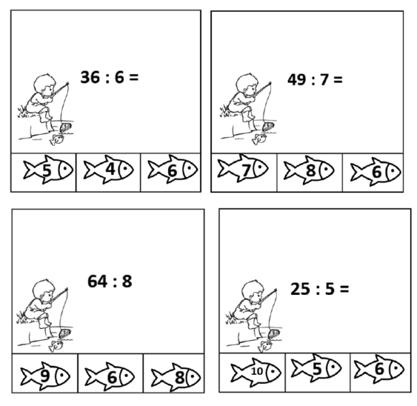 Dalīšana un reizināšana. Makšķerniekam jāatrod īstais loms! Spēlei var izmantot knaģus vai tāfeles marķierus!