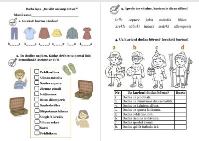 Darba lapa palīdz bērniem iepazīt apģērbu nosaukumus un izvēlēties piemērotu apģērbu dažādām situācijām.