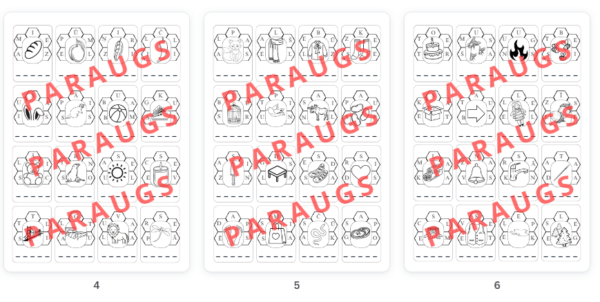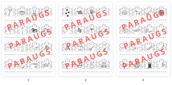 6 darba lapas, katrā lapā bērns var izveidot sešpadsmit vārdus (visi vārdi sastāv no pieciem burtiem).