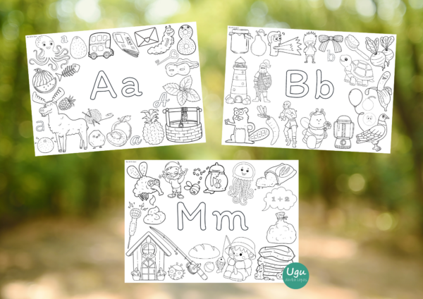 Latviešu valodas alfabēta burti ar krāsojamiem attēliem. Katrā darbā lapā iekļauti attēli, kuri sākas ar doto burtu (aptuveni ~85%) un attēli, kuri nesākas ar doto burtu.