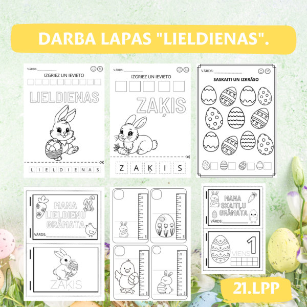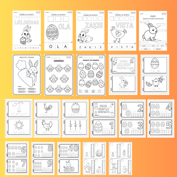 🟡 Materiāls –  darba lapas “Lieldienas”. Griez, līmē, raksti, skaiti, krāso.