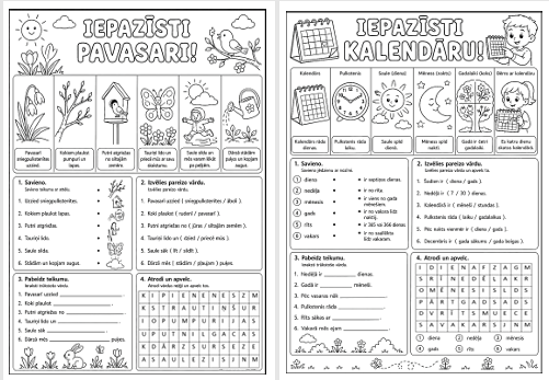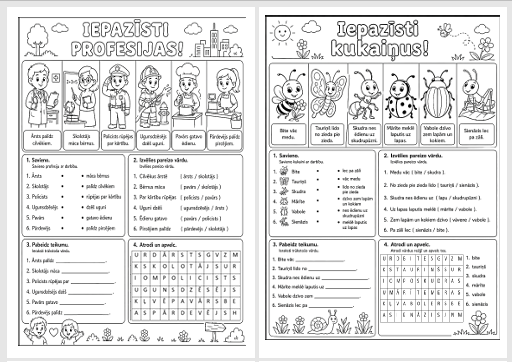 6 tēmas: profesijas, kukaiņi, pavasaris, kalendārs, putni, puķes.